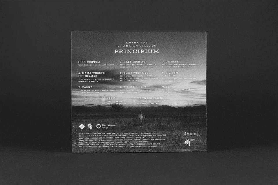 Schrift im Nebel. Verschwommenes Glas. Den grafischen Elementen ein Umfeld zum Wirken geben. Platz lassen um die Wirkung entfalten zu können. Perfekt für die von Chima Ede & Ghanaian Stallion auf "Principium" erschaffene Welt der Musik.